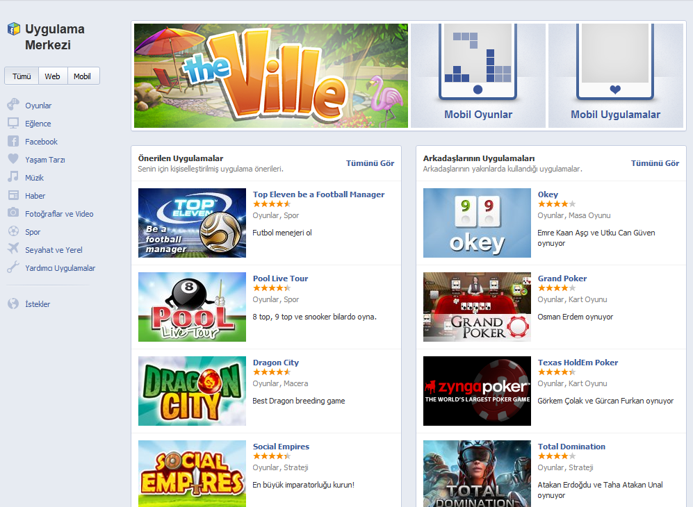 Facebook’un bir süredir çeşitli ülkelerde App Center adı altında mevcut olan Uygulama Merkezi, sonunda Türkiye’de de faaliyette. Uygulama Merkezi, uygulamaların sosyal olarak paylaşılması ve arkadaşlar üzerinden yeni uygulamaların keşfi temeline dayanıyor.