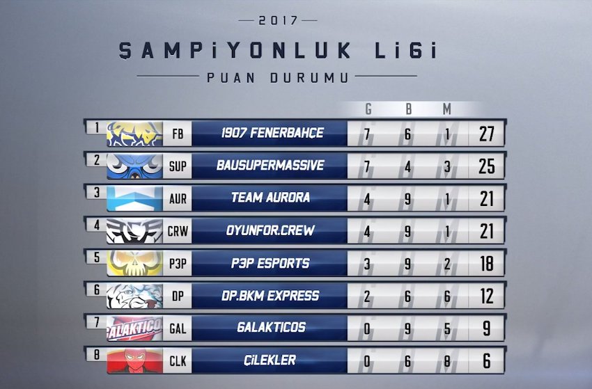 Türkiye’nin tek profesyonel espor ligi olan League of Legends 2017 Şampiyonluk Ligi Yaz Mevsimi lig aşaması, GittiGidiyor sponsorluğunda yarışan 1907 Fenerbahçe Espor’un liderliğinde sona erdi. Son haftada ligin namağlup takımı Oyunfor.CREW’a ilk yenilgisini tattırarak 27 puanla ligi zirvede kapatan 1907 Fenerbahçe Espor, mevsim finallerine doğrudan yarı finalden katılmaya hak kazandı.
