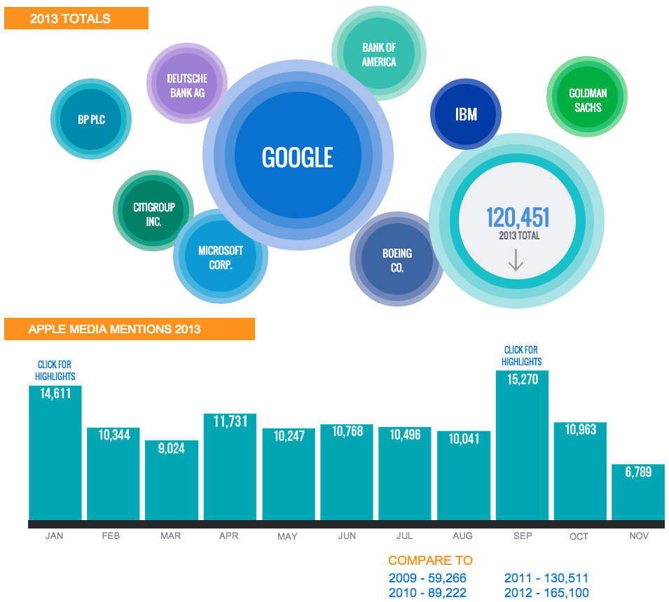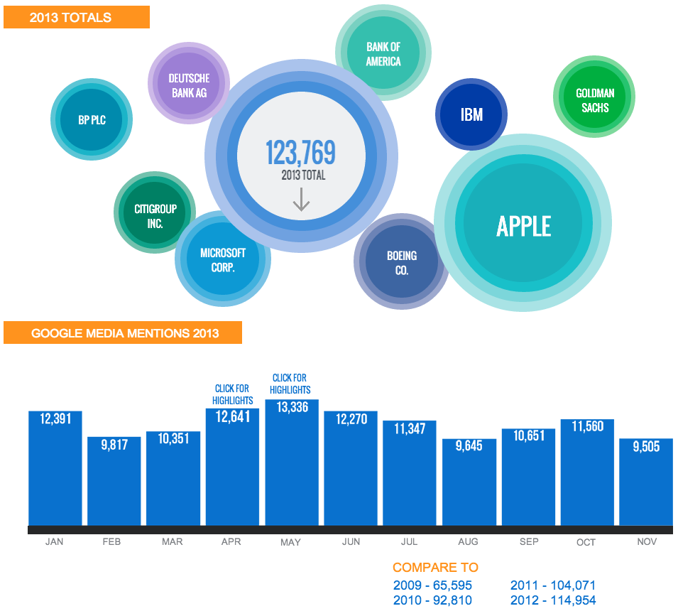 Dow Jones’un yayınladığı veriler, 2013’te küresel medyada Google’ın 123 bin 769 kere adının geçtiğini söylüyor. Geçtiğimiz sene bu sayı 114 bin 954 iken 2011’de 104 bin 71 idi. Google’ın medyadaki varlığını durmadan arttırdığını söylemek mümkün.