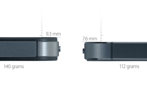 Daha ufak bir bağlantı arabirimi, birleştirilmiş telsiz çipi ve dokunmatik elektrotların piksellere entegre edilmesi ile iPhone 5, 9.3mm’den 7.6mm’e incelmiş. Ayrıca 28 gram da hafiflemiş, iPhone 5’in ağırlığı sadece 112 gram.