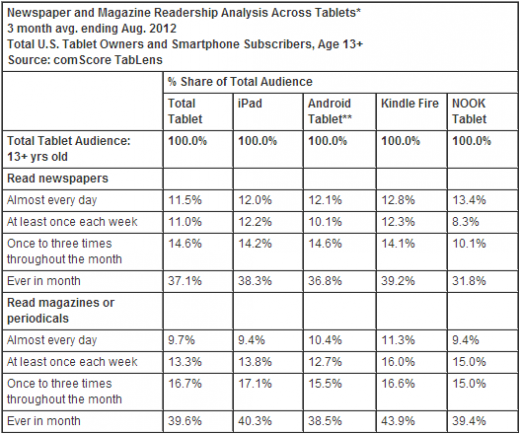 Ağustos ayında Kindle Fire kullanıcılarının %39.2’si gazete okumuş. iPad kullanıcıları içinse bu rakam %38.3. Barnes & Noble’s’ın Nook tableti ise günlük okuma oranlarında en yüksek değere sahip, kullanıcıların %13.4’ü her gün gazete okuyormuş!