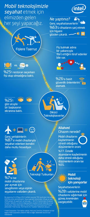 Araştırmaya göre tatilcilerin yaklaşık yarısı (yüzde 44) seyahat ederken Ultrabook, tablet ya da dizüstü bilgisayarları yanlarında değilse tedirgin hissettiğini, 18 – 29 yaş arası genç yetişkinlerin yüzde 87’si mobil cihazlarıyla seyahat ederken daha mutlu olduklarını söylüyor. Öyle ki araştırmaya katılanlar için seyahatleri sırasında mobil cihazlarını kaybetmek (yüzde 77), alyanslarını kaybetmekten (yüzde 55) daha stresli bir durum.