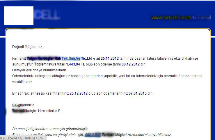 Bilgisayar kullanıcıları .exe uzantılı sahte e-faturaları açtığında zararlı yazılımlar bilgisayarlarına yükleniyor.Yakın zamanda GSM operatörünün faturasıymış gibi görünen bir dosyaya bu şekilde rastlandı. Bilgisayara yüklenen zararlılar, dolandırıcıların bilgisayarların kontrolünü ele geçirmesine ve şahsi bilgilerinin çalınmasına neden olabiliyor.