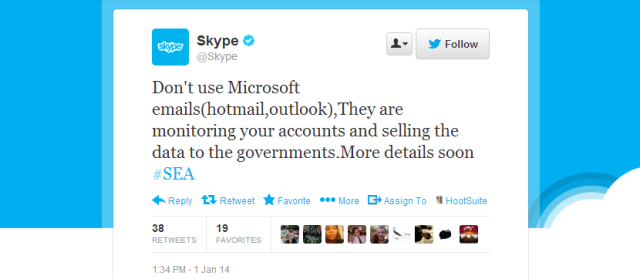 Skype’ın Suriye Siber Ordusu tarafından ele geçirilen hesabından yazılan tweet’te “Microsoft hesaplarınızı (Hotmail, Outlook) kullanmayın çünkü hesaplarınızı izleyip bilgilerinizi hükümetlere satıyorlar.” denildi.