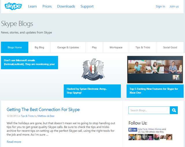 Skype’ın şirket blogunda da “Suriye Siber Ordusu tarafından ele geçirildi. Casusluk yapmayı bırakın!” ibareleri görüldü.