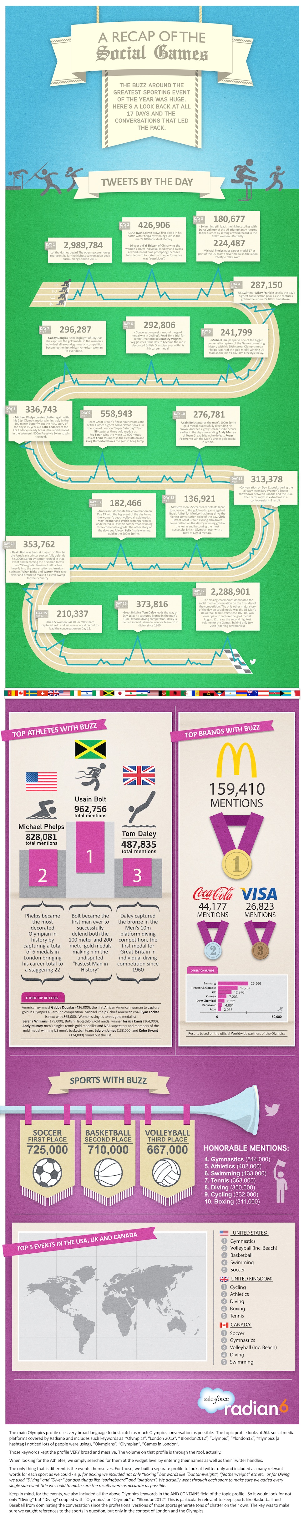 Jameikalı koşucu Usain Bolt, oyunlar sırasında toplamda 960.000 kere adı anılarak şüphesiz en büyük kazanan oldu. Amerikan yüzücü Michael Phelps ise sosyal medyada gümüş madalyayı 830.000 kez anılarak aldı. İngiliz dalıcı Tom Daley ise biraz daha geride kalarak, 490.000 kez anılarak bronz madalyanın sahibi oldu. Tom Daley’nin sosyal medyadaki popülerliğinin çoğunlukla Twitter’daki bir “troll”ü başından savmasının ardından gelen karizmayla geldiğini düşünüyoruz.