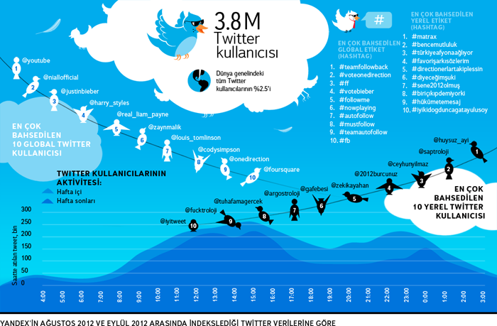 Yandex’in 2012 yazında elde ettiği Türkçe Twitter verilerine göre, 3.8 milyondan fazla Türkçe Twitter kullanıcısı bulunuyor – bu sayı tüm aktif Twitter kullanıcılarının %2.5’ine denk geliyor. Türk kullanıcıları, hafta içinde günde ortalama 3.7 milyon tweet atarken, hafta sonları ise günde ortalama 2.5 milyon tweet atıyor. Hafta içlerinde saniyede atılan tweet sayısının 42’den fazla olduğu görülüyor.