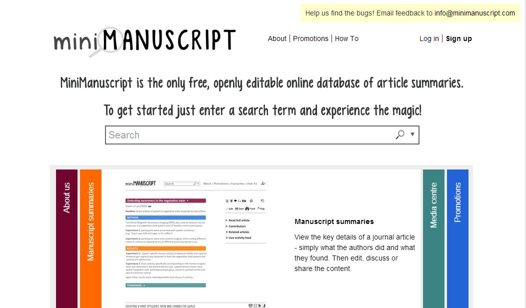 Yeni yayına başlayan MiniManuscript, üniversite öğrencilerinin en büyük yardımcılarından birisi olacak gibi görünüyor.  Özellikle akademik kariyer yapan üniversite öğrencilerine ve araştırma yapan akademisyenlere yönelik bir site olan MiniManuscript, 1966’dan günümüze yayınlanmış 23 milyon makalenin özetlerini barındırıyor. Aynen Wikipedia’da olduğu gibi kullanıcıların içerik geliştireceği MiniManuscript’te arama sonuçlarına göre istenen makalenin mevcut özetleri görüntülenebiliyor, yeni içerik eklenebiliyor. Site kurucuları tarafından, “asıl filmi izlemeye karar vermeden önce izlenen kısa tanıtım filmlerinin akademik karşılığı” şeklinde tanımlanıyor.