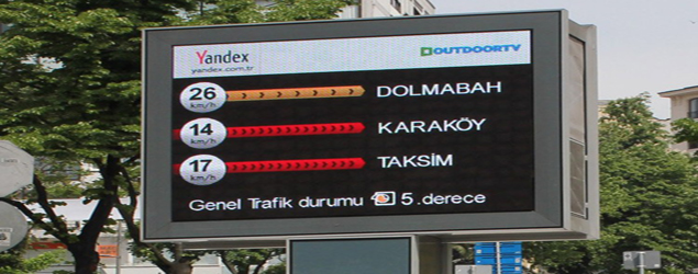 Taksim, Kadıköy Rıhtım Caddesi, Beşiktaş Meydanı, Mecidiyeköy Meydanı, Bakırköy Özgürlük Meydanı, Ataşehir Meydanı gibi İstanbul’un en kalabalık noktalarında ve meydanlarında, araç sürücüleri ve yayalar tarafından kolaylıkla görülebilecek noktalarda konumlandırılmış bulunan 12 büyük LED ekran, Yandex’in sağladığı gerçek zamanlı trafik bilgilerini yayınlamaya başladı. Her bir ekranda, ekranın bulunduğu noktayla bağlantılı 3 adet önemli güzergahdaki ortalama trafik hızı ve şehir genelindeki ortalama trafik durumu derecesi gösteriliyor.