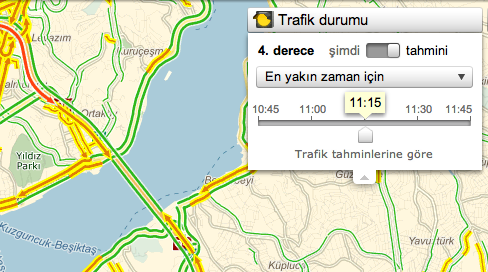 Bugün hizmete sunulan yeni özellik, trafiğin normal şartlarda nerelerde ve ne zaman sıkışık olduğunu gösteren Trafik İstatistiği servisinden farklı olarak, halihazırdaki trafik durumu verilerini de göz önünde bulunduruyor ve 15, 30 veya 45 dakika sonra trafikte beklenebilecek gelişmelere dair net tahminlerde bulunabiliyor.